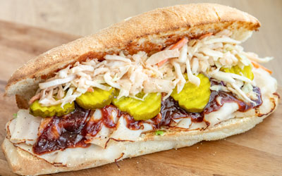 Shaved Chicken, BBQ Sauce, Dirty Bird Sauce, topped with BBQ Cole Slaw, and your choice of Pickles – TOASTED